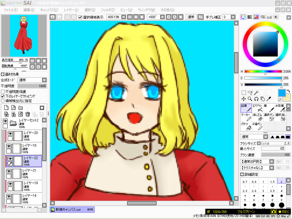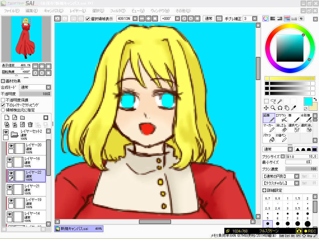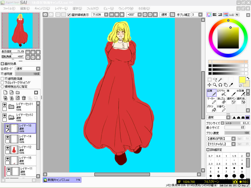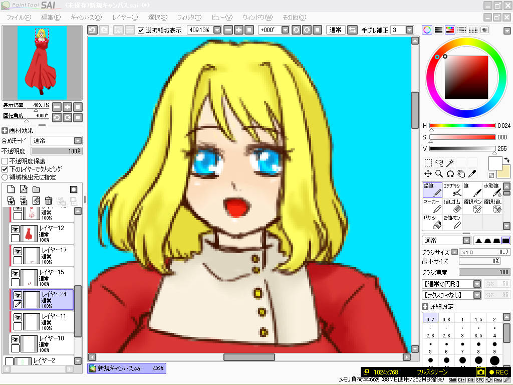 なんとなくこんな感じで描こうかな、みたいなのをとります 2.素体っぽいの 足が描けなくなったのでちょっと伸ばす 3.アタリを消す まぁ、非表示にするだけなんですけどね 4.主線① 乳の辺り 5.主線② ドレスをざかざかっと 6.主線③ 靴を全く考えてなかったので適当にそれっぽいものを 7.主線④ 髪の毛っすね。斜めにしたり左右反転したりしながら描きます 8.主線⑤ 全体にはこんな感じー 9.主線⑥ 素体を消してみました 10.主線⑦ いらない線を消して、主線完成 11.色① 肌…というか、顔です 12.色② わかりにくいですが頬に赤みを入れました 13.色③ 適当に色を置きます。後ではみ出したところは消す。お分かりかもしれませんがドレスをちょっと描き直してます 14.色④ 靴に適当な影を入れて水彩でぼかします 15.色⑤ ドレスに影入れ 16.色⑥ なんか胸のとこのあれ 17.色⑦ 髪の毛 18.目① 目の地色は明るい水色です 19.目② 影を入れてー 20.目③ 瞳孔をぼんやり入れてー 21.目④ ハイライト。ついでに頬にも入れる 22.完成 こんなんになりましたとさ! PR この記事にコメントする