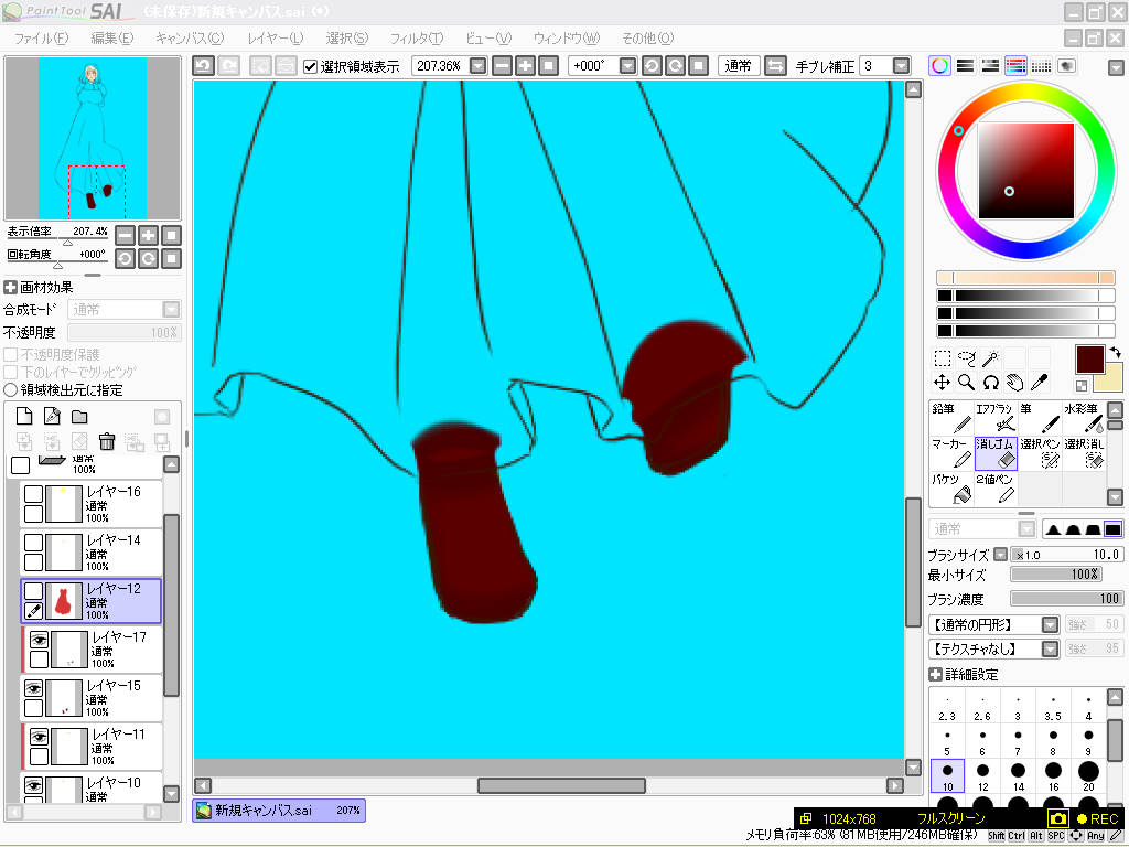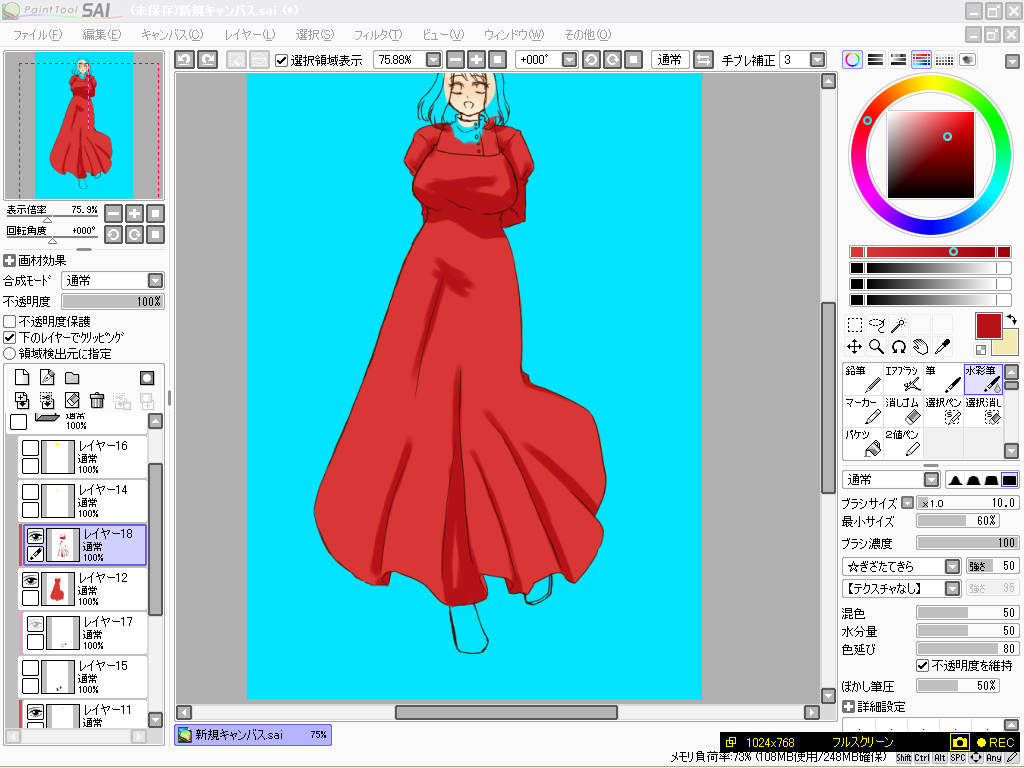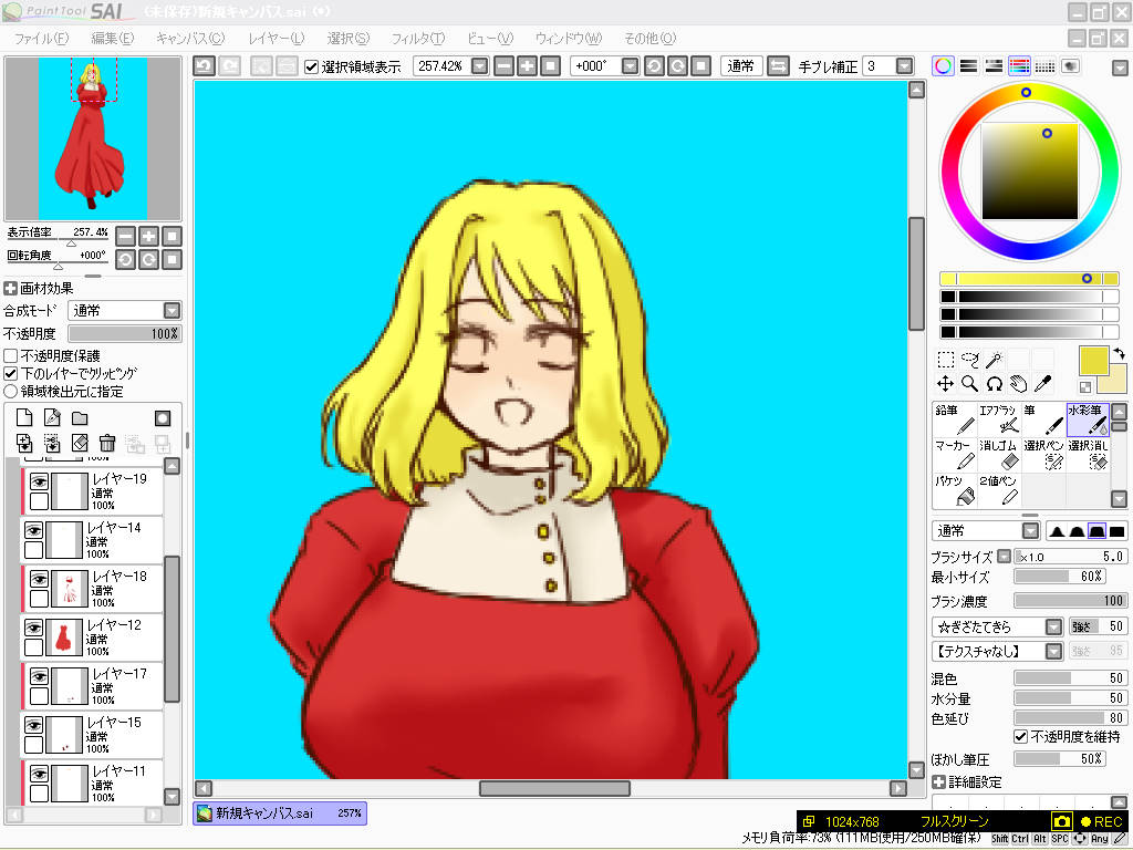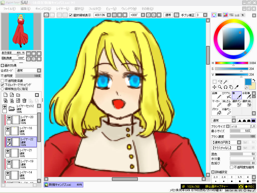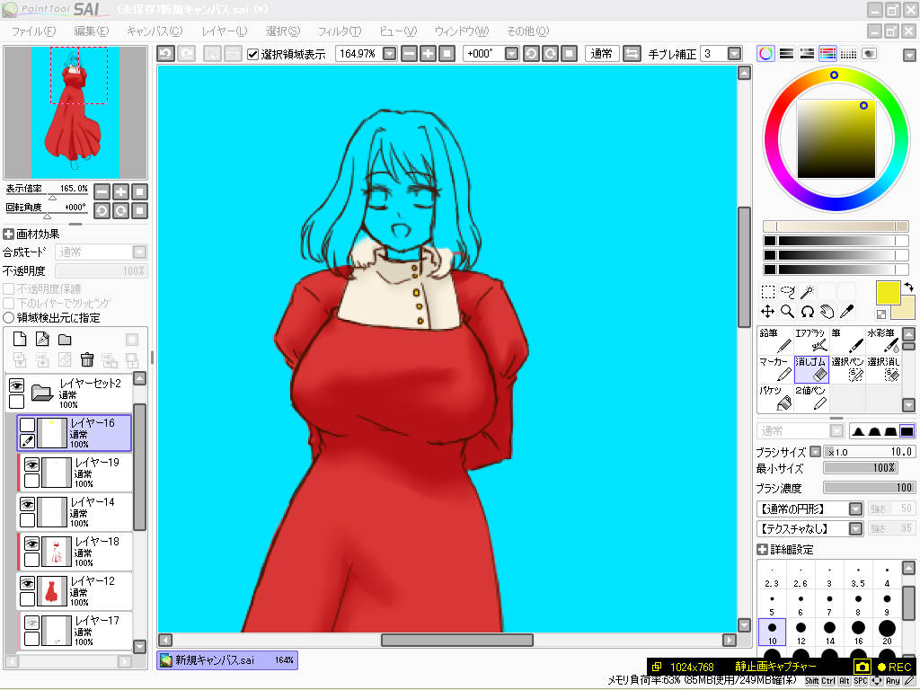 なんとなくこんな感じで描こうかな、みたいなのをとります 2.素体っぽいの 足が描けなくなったのでちょっと伸ばす 3.アタリを消す まぁ、非表示にするだけなんですけどね 4.主線① 乳の辺り 5.主線② ドレスをざかざかっと 6.主線③ 靴を全く考えてなかったので適当にそれっぽいものを 7.主線④ 髪の毛っすね。斜めにしたり左右反転したりしながら描きます 8.主線⑤ 全体にはこんな感じー 9.主線⑥ 素体を消してみました 10.主線⑦ いらない線を消して、主線完成 11.色① 肌…というか、顔です 12.色② わかりにくいですが頬に赤みを入れました 13.色③ 適当に色を置きます。後ではみ出したところは消す。お分かりかもしれませんがドレスをちょっと描き直してます 14.色④ 靴に適当な影を入れて水彩でぼかします 15.色⑤ ドレスに影入れ 16.色⑥ なんか胸のとこのあれ 17.色⑦ 髪の毛 18.目① 目の地色は明るい水色です 19.目② 影を入れてー 20.目③ 瞳孔をぼんやり入れてー 21.目④ ハイライト。ついでに頬にも入れる 22.完成 こんなんになりましたとさ! PR この記事にコメントする